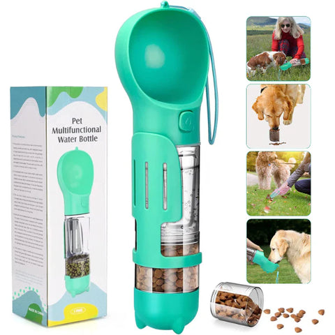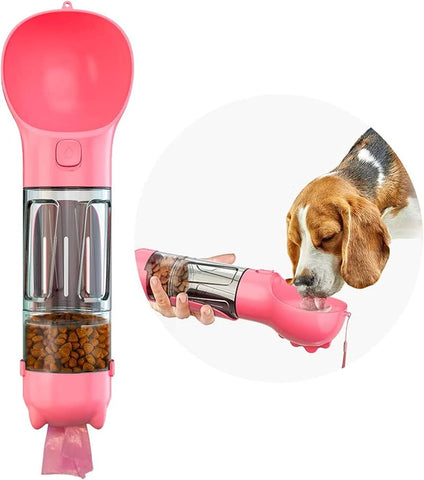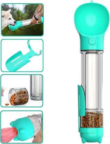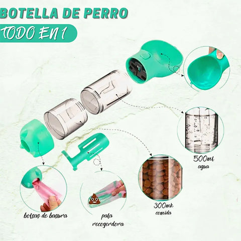 Mantén a tu mascota hidratada, alimentada y con el entorno limpio con la Botella de Agua Portátil Multifuncional 4 en 1. Diseñada para la comodidad de tu amigo peludo y tu conveniencia, esta botella innovadora combina bebedero, contenedor de comida, dispensador de bolsas de desechos y una pala recolectora en un solo producto.